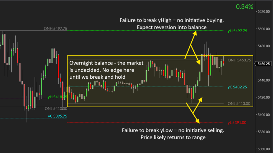Price opened within the prior day’s high and low, a clear signal that we’re starting the session from a position of higher timeframe balance. We’re not at the edges. We’re not breaking structure. We’re sitting right in the middle, waiting for initiative traders to step in.